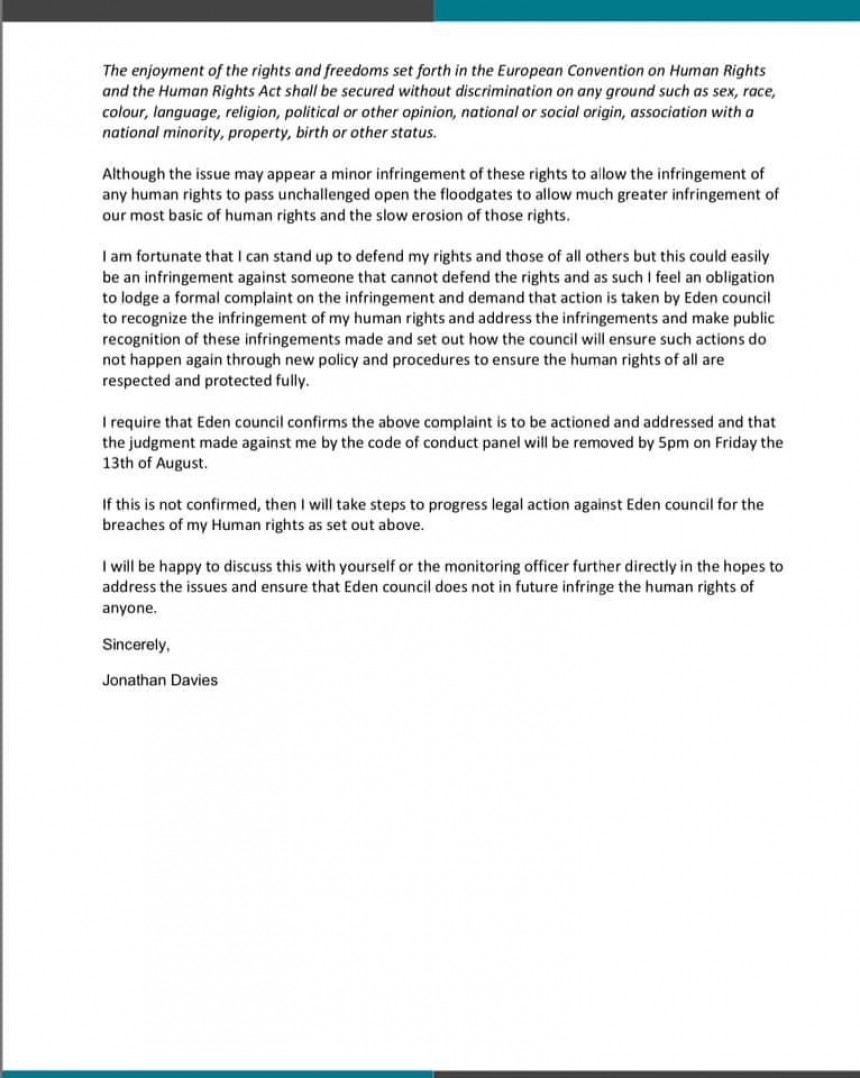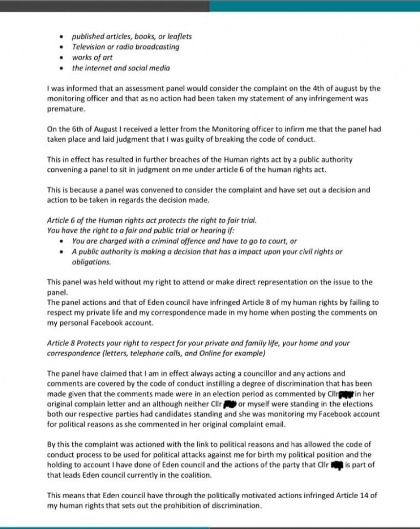 In the interests of transparency here is the formal complaint made to Eden council in regards the infringement of my Human rights through their actions.