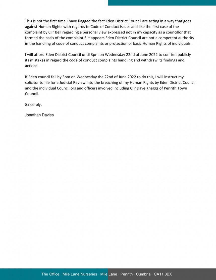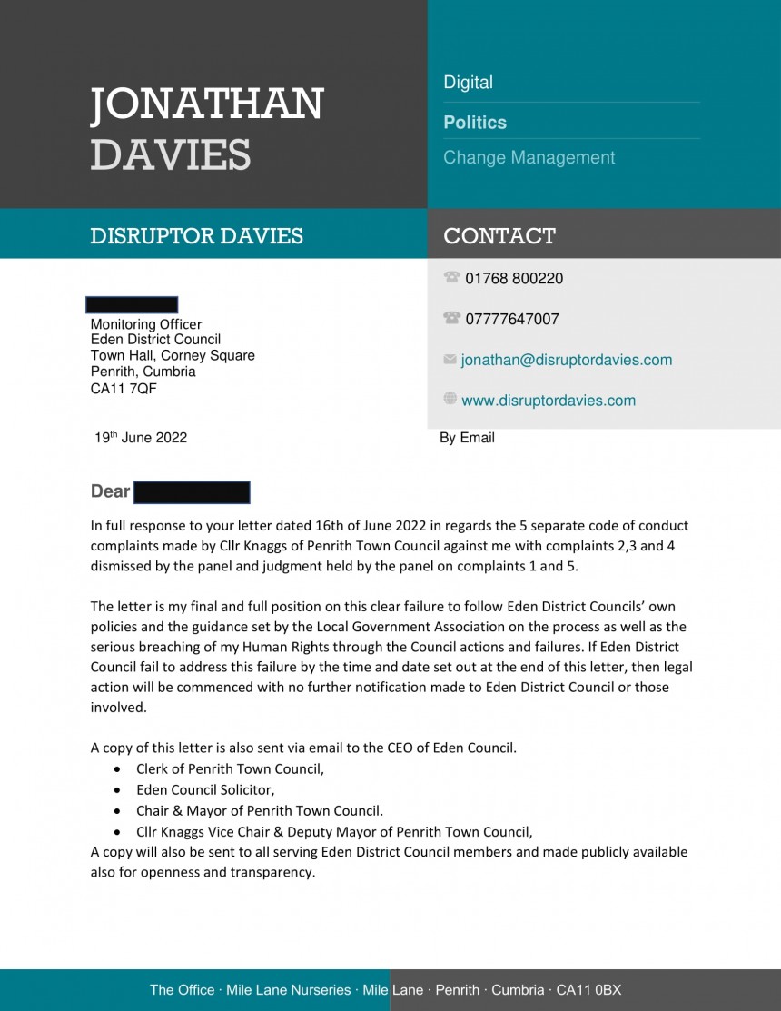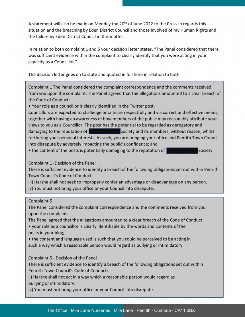 On the 16th of June 2022 the monitoring officer of Eden District Council sent via email to me a letter in regards 5 separate code of conduct complaints made by Cllr Knaggs of Penrith Town Council against me with complaints 2,3 and 4 dismissed by an Eden District Council panel and there judgment and penalties issued by the panel on complaints 1 and 5.