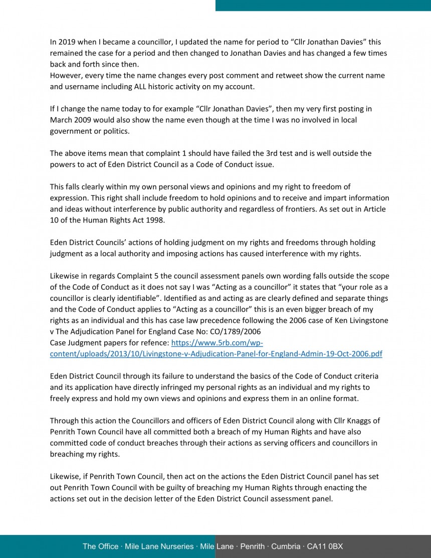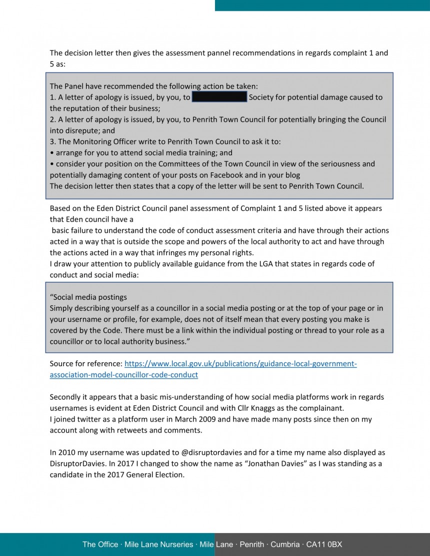 In regards complaint 5 Eden council did not even apply the criteria of “Acting as a Councillor” as the judgment panel simply said that my personal Blog posting means I was “Identifiable as a councillor” This is clear breach of Eden District Councils’ and required application of the code of conduct criteria.