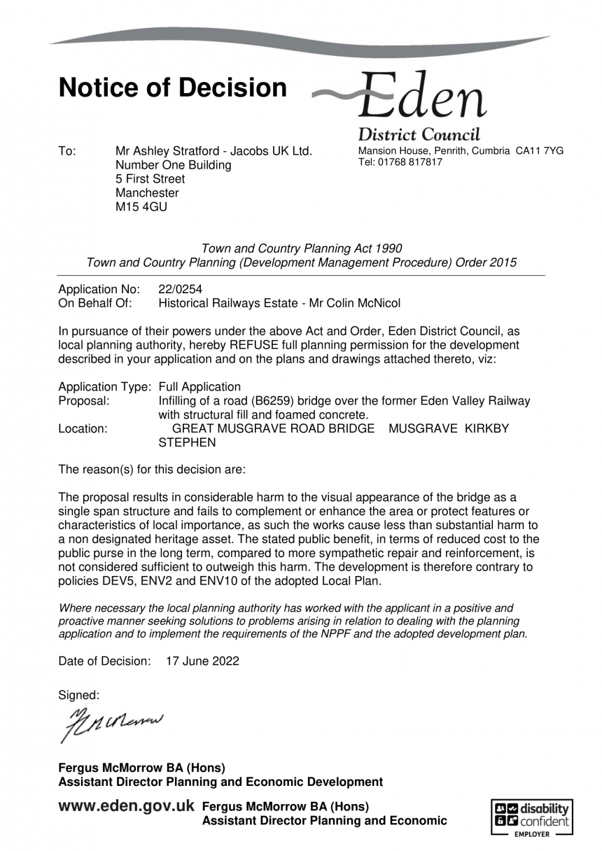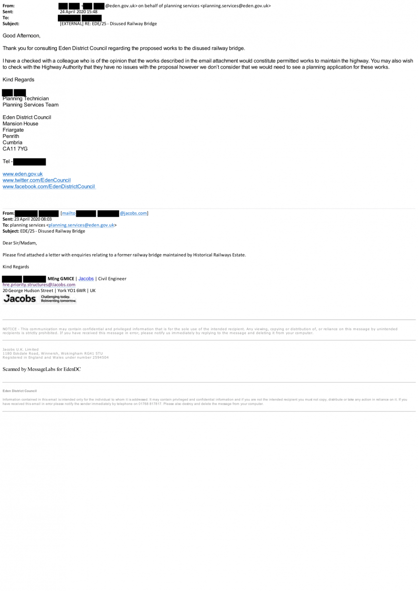 Thank you for consulting Eden District Council regarding the proposed works to the disused railway bridge.